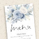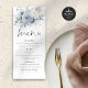 Menu de Casamento de Florais Azuis Dusty Imprimível. Disponível digitalmente e impresso. Uma tipografia informal em preto para o título principal Menu que complementa o resto do texto que você pode facilmente personalizar, com lindas flores e gramíneas coloridas do outono no topo.