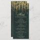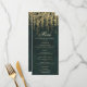 Um elegante e clássico cardápio de casamento, que apresenta uma ilustração com aquarela esbranquiçada de folhagem e videiras feitas digitalmente com ouro sobre verde esmeralda, cintilante com luzes de fadas e poeira mágica: um tema florestal encantado. Um cartão de cardápio elegante e moderno para um casamento de conto de fadas. Perfeito para noivas que amam o cenário de conto de fadas, a floresta de fadas ou o tema do jardim de fadas e o verde esmeralda.