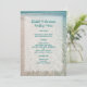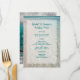 Modelo de cardápio de praia. Areia tropical e fundo marinho com duas modelos de texto em azul-marinho. O título com os nomes do casal está em um script maior. A comida servida, desde aperitivos e bebidas, até ao bolo de casamento e ao bar doce, é apresentada sob a forma de parágrafo. Outra imagem da água do oceano cobrir a parte de trás deste papel de 5 x 7 polegadas. O design é perfeito para qualquer recepção de casamento pelo mar.