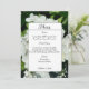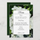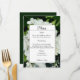 Este é um elegante cartão de cardápio floral de flor branca com flores brancas de hydrangea foto com um fundo verde de floresta. É perfeito para uma celebração de casamento no verão ou no outono.