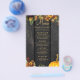 Modelo de menu de festa de aniversário com flores botânicas de outono e abóbora laranja enferrujada sobre uma madeira de celeiro escuro com luzes de corda.