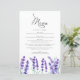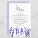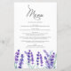 Adicione um sotaque floral elegante à capa de sopa do seu evento com estes cartões de menu de lavanda. Apresenta ilustrações de aquarela de flores lavandas. Personalize adicionando nomes e detalhes do menu. Estes cartões florais de lavanda são perfeitos para casamentos de primavera. chás de panela, chás de fraldas, aniversários e festas semelhantes.