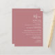 Este simples cardápio moderno de casamento mostra um texto branco sobre um fundo poeirento de rosa. A palavra "Menu" aparece na caligrafia na moda. Adicione o nome do casal e a data do casamento em script e itálico, juntamente com os detalhes do menu na fonte sans serif. O reverso é uma sombra de rosa sólido empoeirado.