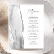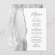 A borda esquerda deste elegante cardápio moderno de casamento mostra uma cinza de agata de design com cinza falsa. O texto personalizável combina o script de escrita manual de cinzas de carvão e as fontes sans serif em um fundo branco. A cinza e a design de agata prateada são repetidas no verso.