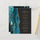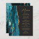 A borda esquerda deste elegante cardápio moderno de casamento apresenta uma cor azul-lacrimogênea agate design aparada com falso brilho dourado. O texto personalizável combina o script de escrita manual dourado e as fontes sans serif em um fundo preto de ardósia escura. O design do chá e do agato de ouro é repetido no verso.