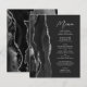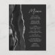 A borda esquerda deste elegante cardápio moderno de casamento mostra uma design de agata preta, aparada com falso brilho prateado. O texto personalizável combina o script de escrita manual de cinzas prateadas e as fontes sans serif em um fundo preto de ardósia escura. O design de agata preto e prateado é repetido no verso.