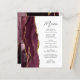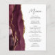 A borda esquerda deste elegante cardápio moderno de casamento mostra uma cor vermelha-de-água borrifada, design, aparada com uma falsa brilha dourada. O texto personalizável combina o script de escrita manual de cinzas de carvão e as fontes sans serif em um fundo branco. O design de burlagem e de ouro é repetido no verso.