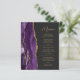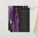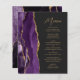 A borda esquerda deste elegante cardápio moderno de casamento apresenta um design de agata de cor-d-água roxa, aparado com uma falso brilho dourado. O texto personalizável combina o script de escrita manual dourado e as fontes sans serif em um fundo preto de ardósia escura. O design de agata roxo e dourado é repetido no verso.