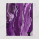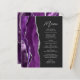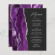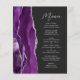 Este elegante cardápio moderno de casamento apresenta uma cor d'água púrpura e borda agitada com falso brilho prateado. O texto personalizável combina o script de escrita manual de cinzas prateadas e as fontes sans serif em um fundo preto de slate. O design de agato roxo e prateado é repetido no verso.