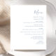 Este simples cardápio moderno de casamento contém um texto azul empoeirado sobre um fundo branco. A palavra "Menu" aparece na caligrafia na moda. Adicione o nome do casal e a data do casamento em script e itálico, juntamente com os detalhes do menu na fonte sans serif. O reverso é uma sombra correspondente de azul poeirento sólido.