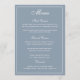 Uma maneira elegante de mostrar aos seus convidados as opções do menu. Em azul empoeirado com escrevendo branco. Uma fonte elegante de casamento de script foi combinada com um estilo moderno, com uma fonte de todos os bonés criando um cardápio de casamento na moda, mas amigável. Foi alocado um amplo espaço para as opções do menu.