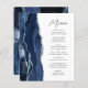 A borda esquerda deste elegante cardápio moderno de casamento apresenta um marinho azul de água, agate design, aparado com falso brilho prateado. O texto personalizável combina o script de escrita manual de cinzas de carvão e as fontes sans serif em um fundo branco. O design de agata azul e prateado do marinho é repetido no verso.
