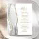 A borda esquerda deste elegante cardápio moderno de casamento apresenta uma cinza e uma aquarela branca aparada com uma falsa brilha dourada. O texto personalizável combina um script de escrita manual branco e dourado e fontes em um fundo branco. O verso apresenta uma cinza correspondente e um design de agate dourado.