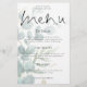 Menu Moderno de Casamento de Script Eucalyptus. Um preço orçamentário de 5,5" x 8,5", em uma elegante estoque LINEN de 110 lb - para uma sensação de luxo pelo valor do excelente, isso é perfeito para menus, além de convites e programas, etc. Este alternativo de tamanho de orçamento também está disponível em outras opções de papel. O estoque do cartão SEMI-GLOSS de 110 lb tem aproximadamente a mesma espessura do cartão postal, portanto também funciona bem para convites. O papel FELT de 100 lbs é colorido por buff, NÃO branco, então adiciona um toque rústico. O estoque de papel MATTE de 80 lb é branco brilhante, para impressão nítida, excelente para seus menus e programas, enquanto o papel SATIN de 80 lb é fino e leve, ideal para gabinetes. NOTE QUE OS ENVELOPES OPCIONAIS SÃO UM POUCO MAIORES NO TAMANHO AT 6,75" x 9" aprox. Este design moderno tem Menu em um script set elegante no topo e o resto do texto centrado abaixo do qual você pode facilmente personalizar, com um fundo de cor azul de eucalipto.