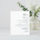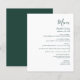 Este simples cardápio moderno de casamento mostra um texto verde esmeraldo sobre um fundo branco. A palavra "Menu" aparece na caligrafia na moda. Adicione o nome do casal e a data do casamento em script e itálico, juntamente com os detalhes do menu na fonte sans serif. O reverso é uma sombra de verde esmeralda sólido.