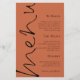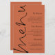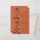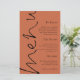 Um tamanho de preço orçamentário de 5,5" x 8,5", Este design de terracota contemporâneo tem Menu em um script de conjunto elegante rodando para o lado esquerdo e o resto do texto está alinhado à direita, que você pode personalizar facilmente, assim como seus nomes e data de casamento no verso. As cores do texto e do plano de fundo em ambos os lados podem ser alteradas para qualquer uma de suas opções por meio da opção personalizar mais.
