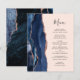 A borda esquerda deste elegante cardápio moderno de casamento apresenta uma marinho azul de aquarela agata bordada com falso brilho rosa de ouro. O texto personalizável combina o script de escrita manual e as fontes de impressão em cinzas de carvão em um plano de fundo cor-de-rosa pincelado. O verso apresenta um design marinho de agate azul e rosa dourado correspondente.