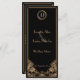 Este belo e na moda negro e cardápio de recepção de casamento de ouro tem um tema "Excelente Gatsby" nos anos vinte, inspirado pelo ressurgimento na cultura popular da estética design relativa à era Art Deco de 1920. Um padrão complexo e intrincado cria uma estrutura geométrica em tons sombreados de bege que se combinam para dar um efeito dourado. As iniciais ou monogramas da Noiva e do Groom são enfatizados numa cor contrastante de cinza prateada.