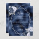 Este elegante menu de casamento moderno apresenta um quadro geométrico prateado decorado com buquês florais azuis, marinhos e prateados empoeirados num fundo de folha azul marinho. O texto personalizável combina a escrita manual imétrica de cinzas prateadas, a placa de cobre e as fontes itálicas.