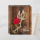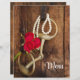 Personalize o Menu de Casamento Ocidental do País Rústico de Rosas vermelhas de Quadrinhos e Bits de Cavalo com os detalhes da refeição que você servirá na sua fazenda rural ou no almoço de chá de panela do tema rancho, janto de ensaio de casamento ou recepção de casamentos. Personalize-o com os nomes da noiva e noiva, local e data. Este encantador menu nupcial sobre o tema equestre, personalizado, apresenta uma fotografia floral ligeiramente melhorada e digital de flores de rosa vermelha, colar de pérolas brancas, rédeas de cavalo e de couro com um fundo de madeira de cascata castanha.