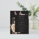 Este elegante menu de casamento, humorístico, apresenta um buquê floral romântico, luxuoso, no marfim, com folha de ouro rosa e folhagem brilhante num fundo negro. Personalize o texto cor-de-rosa rosa em fontes na moda num retângulo preto. A parte traseira da placa é preta e sólida.