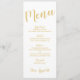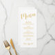 Cartão de Menu Branca de Script Moderno e Dourado, com título em fonte de script moderno dourado com detalhes do menu de casamento em fonte de sans serif dourada em fundo branco. Nota: Os detalhes da folha são simulados no trabalho de arte. Não será utilizada nenhuma folha de alumínio real no fazer deste produto.