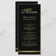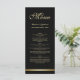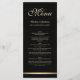Um moderno cardápio elegante de casamento preto e ouro.