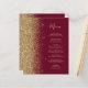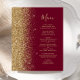 A borda esquerda deste elegante menu de casamento moderno apresenta uma borda falsa dourada. O texto personalizável combina um script de escrita manual branco de cor dourada e fontes em um fundo vermelho burgundy. O verso apresenta um design de burgundy e dourado.