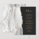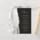 A borda esquerda deste elegante cardápio moderno de casamento apresenta uma cinza e uma aquarela branca aparada com uma falsa brilha dourada. O texto personalizável combina um script de escrita manuscrita branco de cor dourada e fontes em um fundo escuro. O verso apresenta uma cinza correspondente e um design de agate dourado.