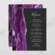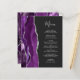A borda esquerda deste elegante cardápio moderno de casamento apresenta uma cor d'água roxa, borda agitada com falso brilho prateado. O texto personalizável combina o script de escrita manual de cinzas prateadas e as fontes de impressão em um fundo fora do preto. O verso apresenta um design de agata prateado e roxo correspondente.