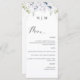 Menu de casamento elegante monograma com elegante verde-coloração-d'água e detalhes florais brancos e azuis em cima com iniciais de casal. Capacidade de adicionar seu próprio menu usando caixas de texto fornecidas e, se necessário, fazer ajustes de posição, tamanho, estilo e cor do texto selecionando "personalizar mais". O mesmo design também está disponível com fundo em azul empoeirado e em marinho. Parte da nossa coleção "Elegant Bliss" com uma variedade de produtos de coordenação disponíveis, incluindo cartões de lugares, placas de assentos, números de mesas, sinais de eventos e muito mais.