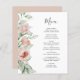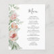 A borda esquerda deste cardápio romântico de casamento apresenta buquê floral de cor d'água de pêssego e flores e verde. O texto personalizável combina manuscrito, copperplate e fontes itálicas em cinzas de carvão em um fundo branco. O verso apresenta uma cor sólida coordenadora.