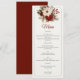Adicione charme sazonal ao seu reception com este menu de casamento de inverno. Projetado com flores festivas vermelhas e marfim, raminhos de pinheiro e caligrafia elegante, é perfeito para casamentos de Natal rústicos. Uma bela maneira de mostrar seus pratos com calor de feriado.