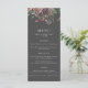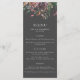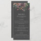 Um elegante cardápio de casamento num esquema de cor escura de cinzas escuras e brancas com flores de cor d'água em beringela roxa, laranja enferrujado e folhas verdes. Personalize com seus nomes e data de casamento.