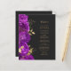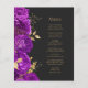 Este elegante cardápio moderno de casamento mostra uma borda de flores roxas e folhas de folhas falsas douradas. Personalize o texto em itálico dourado em um fundo preto de ardósia escura. A parte de trás do menu é a barra sólida preta,