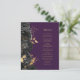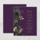 Este elegante cardápio moderno de casamento mostra uma borda de flores pretas e folhas de folhas falsas douradas. Personalize o texto em itálico dourado em um fundo roxo escuro. A parte de trás do menu é roxa sólida.