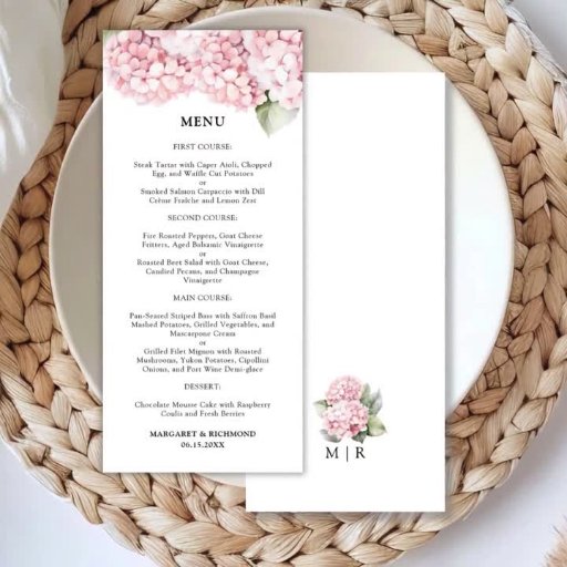 Adicione um toque de elegância ao seu casamento com o nosso 'Menu de Casamento Floral Elegante Hydrangea Pink Blush'. Completando perfeitamente nossa coleção, esse menu promete impressionar seus convidados. Compre agora e defina o palco para uma experiência memorável de jantar!