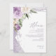 Uma fonte manuscrita, com assinatura combinada com quadros geométricos, fundos cintilantes e florais exuberantes são usados nesta coleção para definir um tom quente e íntimo para o seu casamento. O menu de casamento mostrado aqui, com seu arranjo floral de canto em mauve, lavanda e creme, é um fundo elegante para adicionar suas próprias seleções de menus, nomes e data de casamento. Procure ID889 para ver todos os produtos neste conjunto de casamento.
