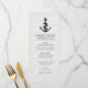 Uma âncora em forma de quadro negro sobre uma madeira esbranquiçada como fundo. Uma fita na âncora diz "menu". Todo texto pode ser facilmente personalizado. Perfeito para um casamento temático náutico, especialmente se for com o olhar rústico ou vintage.