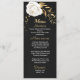 lindas flores brancas e ouro deixam elegante cardápio preto de casamento. Os detalhes de brilho são simulados