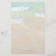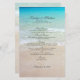 Menu de casamento com tema de praia tropical. Água turquesa bonito e areia de praia é a imagem de fundo com texto preto em script e letra impressa. Adicionar texto aos modelos e criar um menu com um primeiro e segundo cursos e três entradas. Adicione o nome do local, o local e a data do casamento.