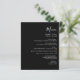 Este simples menu de casamento moderno mostra um texto branco sobre um fundo preto. A palavra "Menu" aparece na caligrafia na moda. Adicione o nome do casal e a data do casamento em script e itálico, juntamente com os detalhes do menu na fonte sans serif. O reverso é preto sólido.