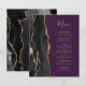 A borda esquerda deste elegante cardápio moderno de casamento apresenta uma coloração aquosa preta, borda agitada, aparada com falso brilho dourado. O texto personalizável combina o script de escrita manual dourada e as fontes de impressão em fundo roxo. O verso apresenta um design de agate preto e dourado correspondente.