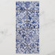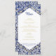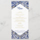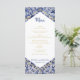 Este design apresenta padrões azulejos portugueses russos. O texto do casamento é elegantemente enquadrado com uma forma geométrica branca e dourada. Design de cardápio floral único Azulejo azul e branco com elementos modernos. Os convites de casamento e outros artigos de papelaria também estão disponíveis.