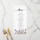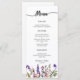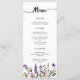 Watercolor Wildflower Simple 3 cursos de cardápio apresenta cabeçalho de caligrafia, borda e salada de flor silvestre, entrada e modelo de sobremesa. Há também espaço para os nomes da noiva e do noivo e a data do casamento. Este layout exato também está disponível com acentos de ouro.