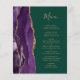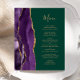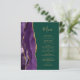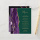 A borda esquerda deste elegante cardápio moderno de casamento apresenta uma cor d'água roxa, borda agitada com falso brilho dourado. O texto personalizável combina um script de escrita manual dourado e fontes de impressão em um fundo verde esmeralda. O verso apresenta um design de agate roxo e dourado correspondente.