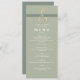 Menu de casamento verde moderno, contemporâneo, com caligrafia simples e uma elegante amante de ouro.