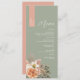 Adicione um encanto rústico suave à sua recepção com este menu de casamento verde sábio personalizado com o nome de cada convidado numa faixa vertical de sotaque de pêssego. As fontes de guião elegantes e um par verde de fundo calmante, maravilhosamente com a romântica pincel, pêssego e florais de marfim no fundo, complementados por folhagem seca para um toque sutil de queda. Ideal para casamentos de vassoura, rústicos ou do campo, este menu dobra como um cartão de na moda e de manutenção. Personalize facilmente o nome de convidado e jante cursos para o dia especial.