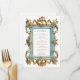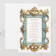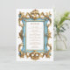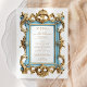 Este menu de casamento elegante apresenta uma moldura azul pastel e dourada em estilo rococó vintage ornamentado. Personalize o texto dourado decorativo com os detalhes do seu menu.