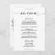 Um menu de jantar clássico que oferece seleções de entradas, prato principal e sobremesas. Os títulos são escritos em uma caligrafia clássica com fonte swash preta e as seleções do menu estão em um texto em bloco fácil de ler. O menu é totalmente personalizável para qualquer ocasião.